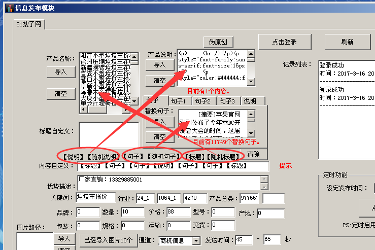【标题】对应产品名称,【句子】对应句子文章,【说明】对应产品说明的,这里特别指出,【说明】或者【随机说明】只需要点击一次就可以了,【句子】标签可以多次点击使用。